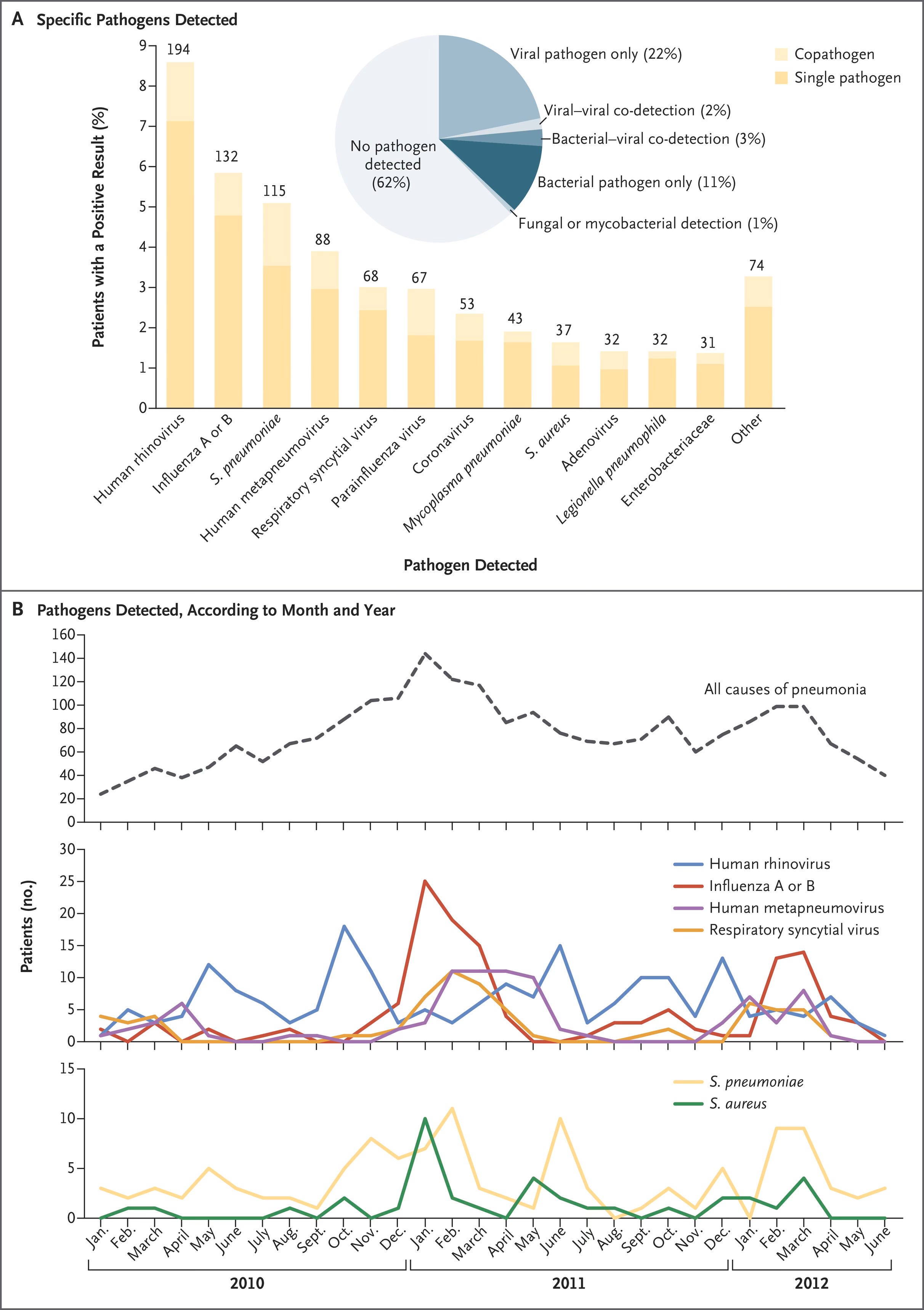 Another example of a PIE study was reported by Jain and colleagues in adults who required hospitalisation for community-acquired pneumonia between 2010 and 2012. The charts nicely illustrate the seasonal ups and downs of agent circulation and add the role of two common bacterial culprits, S. pneumoniae and S. aureus, which, unlike viridiae, respond to antibiotics.