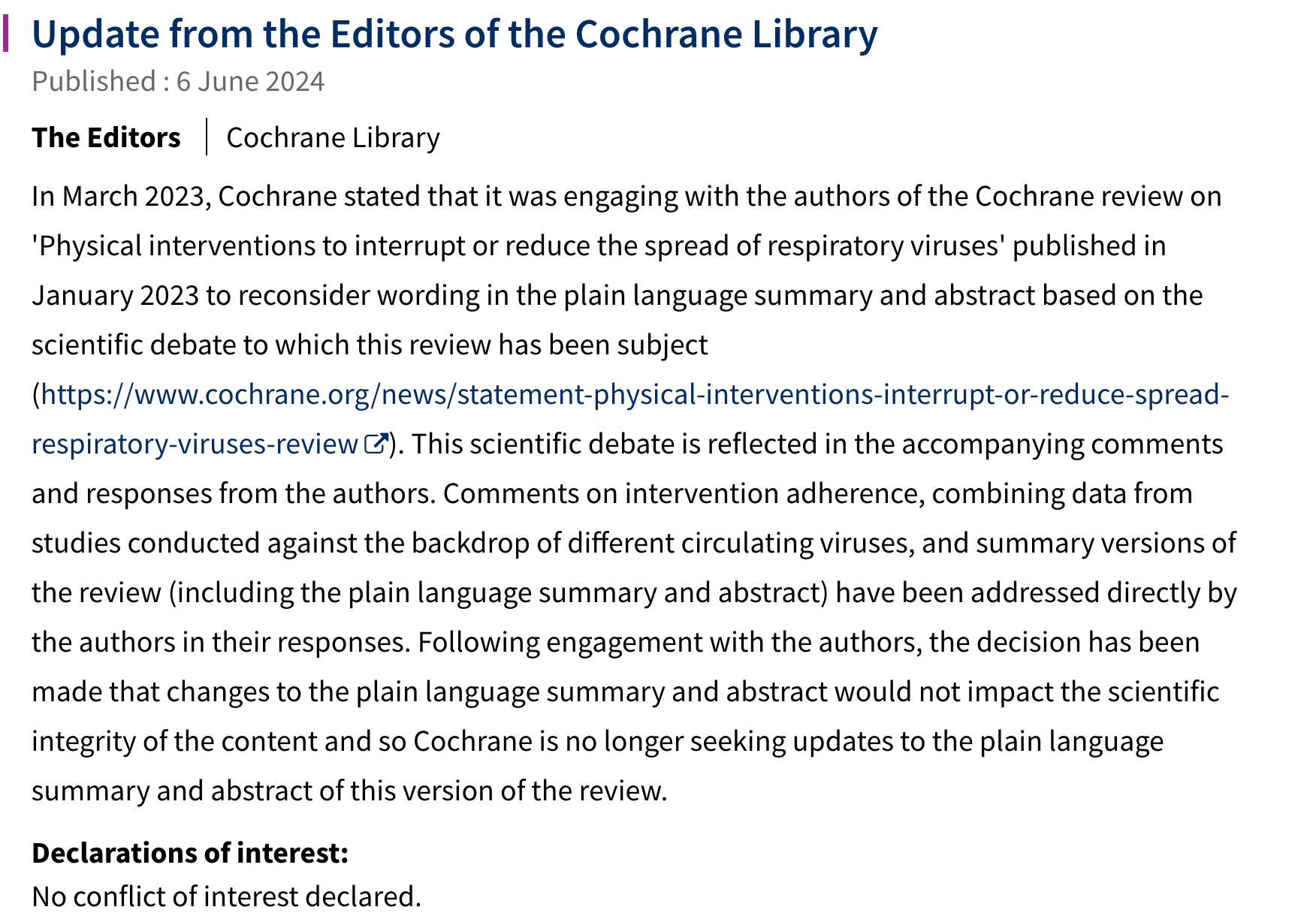 In the midst of the covid panic, some lost their heads - Cochrane leaders have recanted from their original position undermining their own review that they approved and now has mega access figures. However the damage has been done.