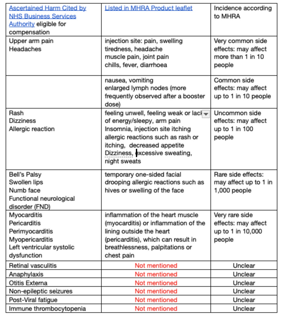 Mooching around the possible harms of Comirnaty, the Pfizer BioNTech Covid-19 vaccine, we came across the list of recognised harms cited by the NHS Business Services Authority. These recognised harms and the degree of disability made the unfortunate subjects eligible for compensation.