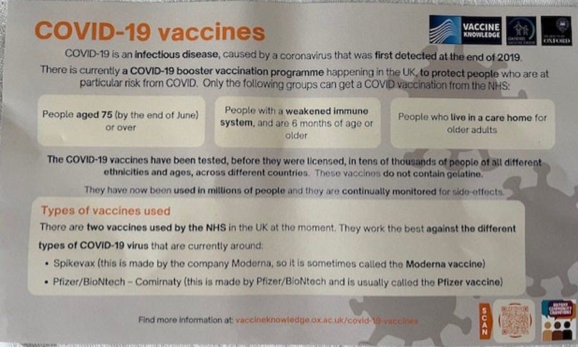 Apologies for the poor quality of the reproduction. The leaflet urges people to be vaccinated with Spikewax or Comirnaty. Due to a lack of resources, we have focused on the latter and have a few comments.