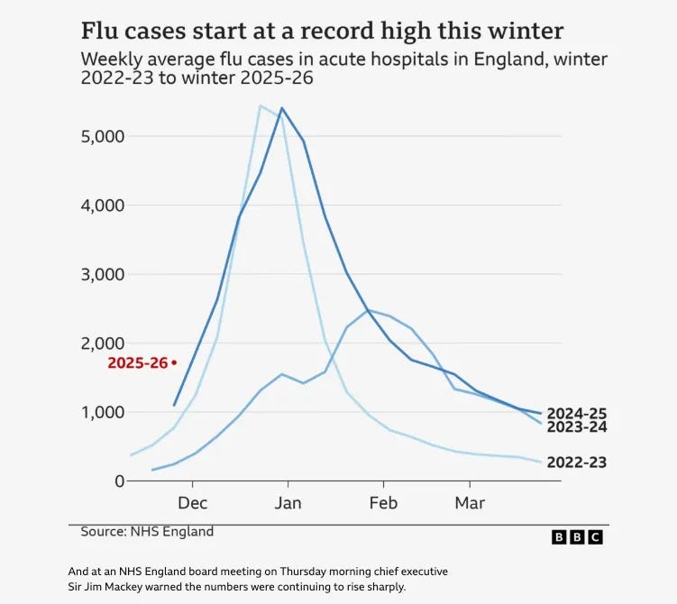 The Daily Mail screaming headline is “Superflu sparks NHS carnage as swamped A&Es turn record number of ambulances away amid fears crisis is going to get even worse with looming threat of strikes and ever-spiralling outbreak.”