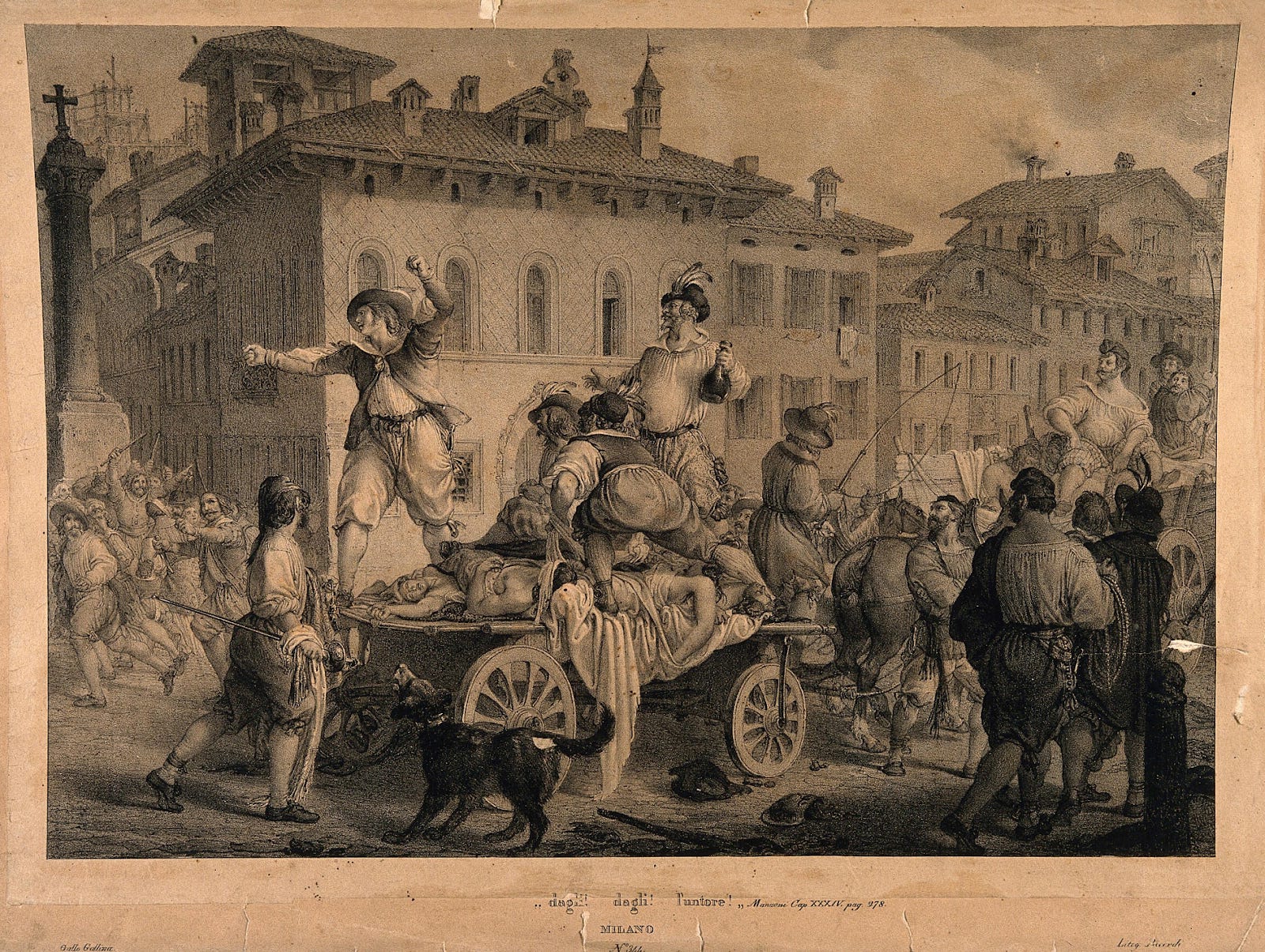 The engraving shows Renzo the main character of the Promessi Sposi, unjustly being accused of being an untore taking refuge on the undertaker's cart. He is threatening his would-be lynchers by waving an infected garment. They recoil in horror. The undertakers are all drunk and are immune, having recovered from the plague. They shout their support for the plague, which is providing them with a job and power over the uninfected.