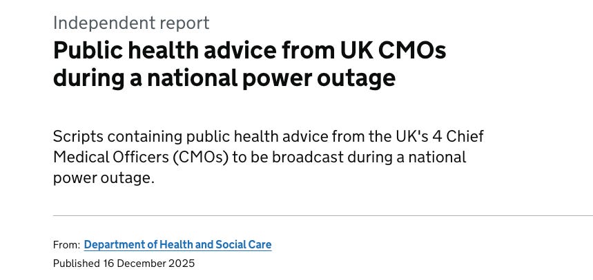 While the “Supeflu” raged - or not, as may be the case - and the waiting lists hovered at 7.4 million, the Chief Medical Officers of the UK thought it would be a neat idea to release their scripts containing public health advice to be broadcast during a national power outage.