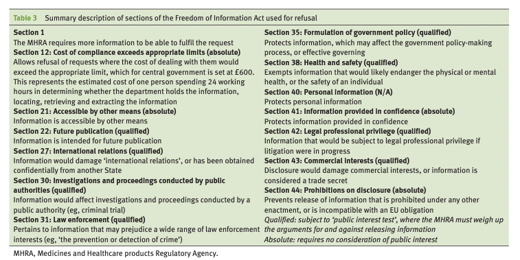 MHRA does not have a sterling record of responding to FOIs. Between 2008 and 2017, a low proportion of requests (41%) were successful. In comparison, the then most recently available data from the USA Food and Drug Administration in 2015 showed that of 10,611 FOI requests processed, 8130 (77%) were fully disclosed.