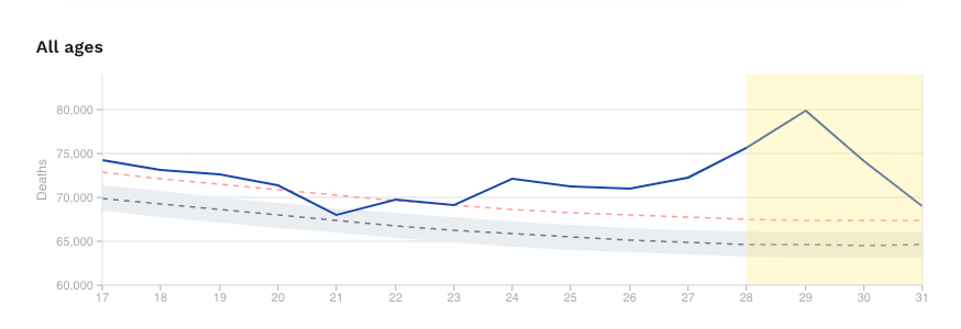 We have been pointing out for under a week that something unusual is happening in the UK. From around week 17 to week 31, there has been a sustained and consistent rise in deaths above the seasonal average, just over 18,000, according to ONS statistics. And no, these are not COVID-related deaths.